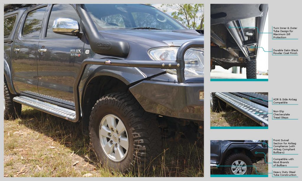 La gama de Side Steps 4×4 de acero de Dobinsons™ se fabrica con tubos de acero de 51 mm (2”) con un grosor de pared de 2.0 mm y se forman utilizando dobladores de tubos controlados por computadora CNC para garantizar que cada curva se mantenga suave, sin pliegues y tenga un espesor uniforme.