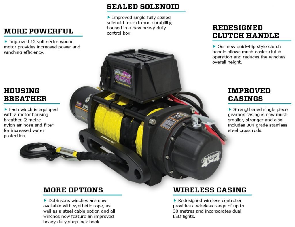 Dobinsons™ lo tiene todo, ya sea si necesita la flexibilidad de los cabrestantes de cuerda sintética o prefiere los winches de cable de acero tradicionales. Haga coincidir su nuevo Winch de segunda generación con nuestros accesorios y estará listo para la acción.